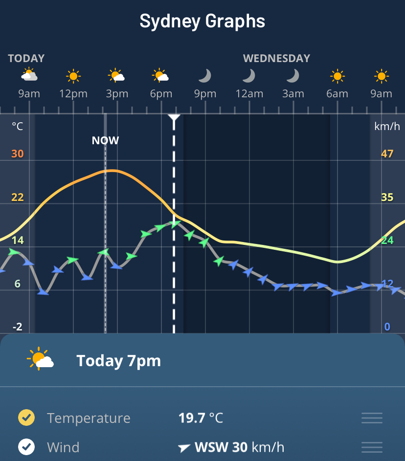 Image: Hourly temperature and wind forecasts for Sydney on the Weatherzone app.
